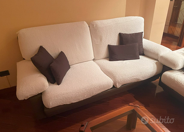 Come da foto, coppia di divani (2 posti comodi ciascuno) in cotone ed eco-pelle. La struttura è stata totalmente rifoderata con nuova eco-pelle 2 anni fa. I divani sono in condizioni eccezionali, pari al nuovo: sedute e schienali sempre coperti da copri-divano, mai utilizzati da bambini o animali.