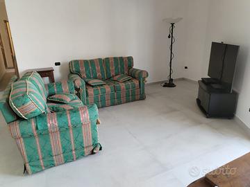 Per rinnovo arredamento, vendo coppia di divani in stile classico, ciascuno da 2 posti, in tessuto verde con riflessi giallo-oro.