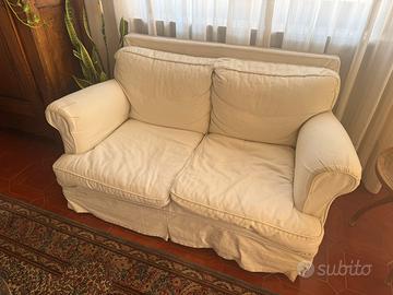 Coppia di divani Regent's 16 di De Padova, anni '80-'90. Struttura in legno con cinghie elastiche, piedi in faggio, rivestimento in tessuto di cotone bianco. Imbottitura in poliuretano espanso a quote differenziate e ovatta di poliestere foderato con vellutino di poliestere; seduta in piuma d'oca con supporto in poliuretano espanso e schienale in piuma d'oca.