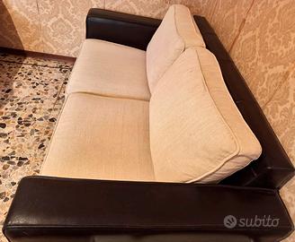 due divani, uno a tre posti che puo' diventare letto a una piazza e mezzo e l'altro a due posti . Braccioli e schienale in pelle marrone e cuscini in tessuto Misure : tre posti cm 210x94 due posti cm 180 x 94
