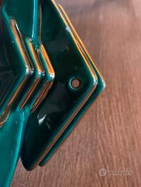 Coppia di eleganti candelabri doppi dalla forma geometrica, realizzati in luminosa ceramica verde smeraldo e oro, dipinti a mano. 25 x 9 cm, altezza: 12,7 cm. Numerati e firmati con iniziale dorata sottostante. In buone condizionj, ; 2 scheggiature piccole posso invaire piu fito per fare cesere lo stato precisanente