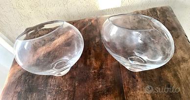 Due vasi uguali in vetro di forma rotonda (altezza e larghezza 20 cm. ca), appiattiti su un lato, con apertura ellittica di 6.5 x 15 cm ca (vedere foto). Adatti per funzione decorativa e per esporre composizioni floreali. Forma inusuale ed elegante. Mai usati. Prezzo contenuto: 6 euro per la coppia.