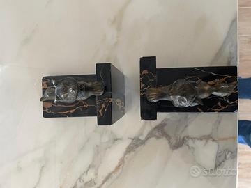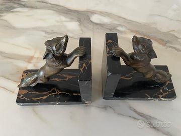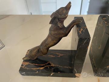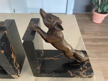 Vendo raffinata coppia di fermalibri vintage, realizzati in bronzo con solida base in marmo nero con eleganti venature dorate. Ogni fermalibro raffigura una volpe in posizione dinamica, oggetti ideali sia per arredare con stile che per collezionisti e amanti del design d’epoca.
