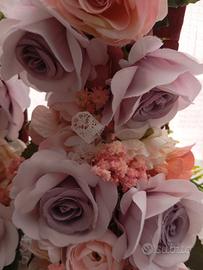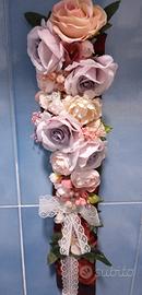 elegante coppia di fermatenda in raso bordoux con merletto e fiocco com rose lilla e rosa
