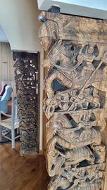 Coppia di spallette alte circa 190 cm, proveniente dall'India, realizzate in legno finemente intagliato. Periodo fine XIX secolo / inizio XX secolo. Nelle foto viene visualizzato un esempio del loro inserimento come elemento divisorio in un ambiente raffinato, ma possono essere inserite in qualsiasi contesto, secondo i gusti personali.