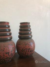Coppia di grandi vasi vintage anni 60 in ceramica smaltata effetto lava nero e rosso.