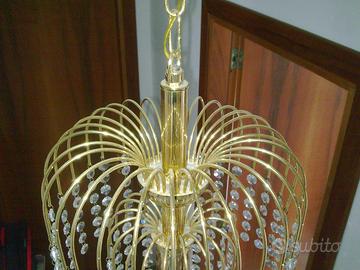 Vendo coppia di lampadari a pioggia bagnati in oro e decorati con cristalli, di diverse dimensioni. Quello più piccolo (riprodotto nelle immagini), è a due cascate e un solo punto luce. Quello grande (non riprodotto perché imballato), è a tre cascate con 6 punti luce (1+5 con possibilità di accensione selezionabile tramite due interruttori). Vendo prezzo RIBASSATO a 170 euro.