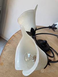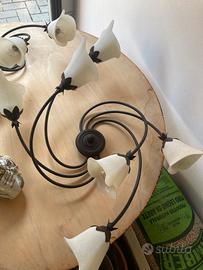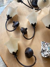 Coppia di lampadari (uno con 6 punti luce e uno con 4), più 3 applique, il tutto illustrato nelle foto. Sono in colore bronzato scuro con “calle” di vetro di Murano (più una di scorta). Tutti completi di lampadine a 40 watt mentre nelle applique a 20 watt.