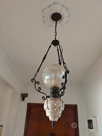 Coppia di lampadari in bronzo, porcellana e vetro, metà del '900. Ottime condizioni.
