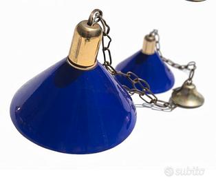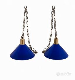 Coppia di lampade a sospensione in stile vintage-industriale, caratterizzate da paralumi in metallo smaltato color blu cobalto, una tonalità molto ricercata e tipica del design tra gli anni ’60 e ’80, spesso utilizzata in ambienti tecnici e cucine professionali; la forma a campana ampia garantisce una diffusione della luce diretta ed efficace, mentre l’interno smaltato bianco è studiato per massimizzare la riflessione luminosa; le catene e gli attacchi in ottone donano un contrasto elegante e caldo, oltre a indicare una produzione di qualità superiore rispetto alle versioni più recenti; si tratta di elementi d’arredo versatili, perfetti sia per ambienti domestici (cucine, isole, tavoli da pranzo) sia per spazi commerciali come bistrot o loft; condizioni buone con normali segni del tempo che ne attestano l’autenticità. Qualsiasi domanda non esitiatevi a scrivere, prezzo trattabile
