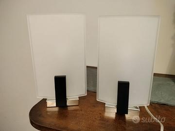 COPPIA DI LAMPADE ABAT JOUR : Vendo coppia di lampade da comodino Abat Jour in stile moderno e lineare, in legno scuro e vetro opaco. La base è in acciaio cromato, è pesante per impedirne il ribaltamento al tocco accidentale. Completano il cavo lungo con tasto per accendere e spegnere la luce; luce calda 'gialla'. Adatta a lampadine a basso consumo energetico. Prezzo 60€ trattabili. Consegna su Genova Sampierdarena.