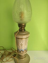 Splendida coppia di lampade da tavolo in stile "lucerna", originariamente nate come lampade a petrolio e sapientemente elettrificate per l'uso moderno. I corpi centrali sono realizzati in fine ceramica (o vetro opaline) color tortora/crema, arricchiti da delicati decori floreali bianchi e azzurri eseguiti a mano con profili in oro zecchino.