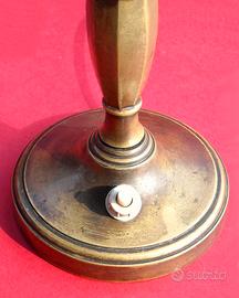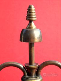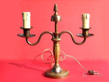 Imitano i candelabri a due fiamme ma sono apparecchi d'illuminazione elettrica. Sono fatti di ottone brunito e risalgono agli anni ’50. Il pinnacolo centrale, la cui forma è uno stilema art déco, serve da presa per sollevare e spostare le lampade. Le finte candele porta-lampadina sono di legno dipinto. Ciascuna lampada misura 25 cm. di altezza, 27 cm. di larghezza e 9 cm. di diametro alla base. Entrambi gli apparecchi sono integri; l’apparato elettrico è funzionante. Le lampadine non sono in dotazione. Il prezzo si intende riferito alla coppia di lampade, che non sono vendibili singolarmente.