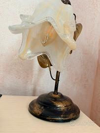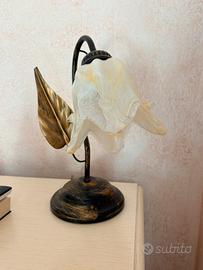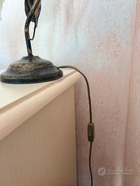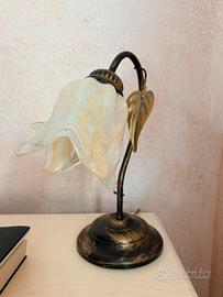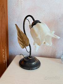 Vendo coppia di lampade da comodino in stile classico, coordinate con lampadario della stessa linea. Perfette per camera da letto o ambienti eleganti. Struttura in ferro con finitura bronzo anticato e decorazioni a foglia. Paralumi in vetro satinato a forma di fiore, che creano una luce calda e rilassante, ideale per la sera. Design raffinato, adatto sia ad arredamenti classici che per aggiungere un tocco vintage.