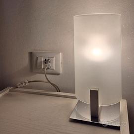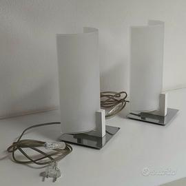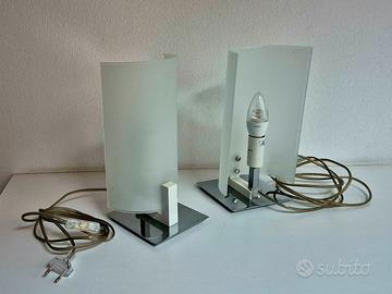 Coppia di lampade da tavolo per interni, Linea Light Group, collezione Wood, codice 90192, versione 00, montatura in metallo con finitura cromo e diffusore in vetro serigrafato/sabbiato bianco, cornice in legno bianco, base 12.6 cm x 12.6 cm, altezza 28 cm, attacco E14
