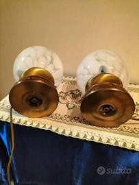 coppia di lampade da tavolo vintage con paralumi sferici in vetro opalino effetto marmo le basi sono in ottone e legno misure in foto