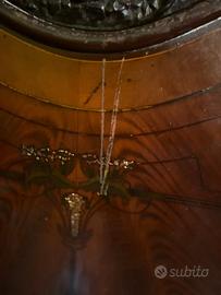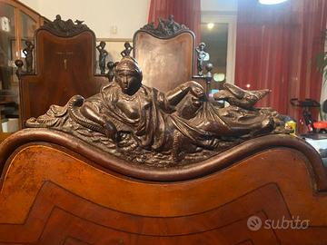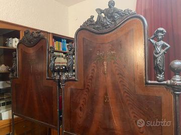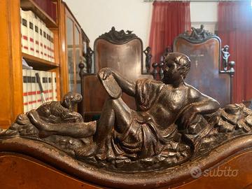 Descrizione dell'Opera: Rara coppia di letti gemelli in ferro/ghisa, eccellente esempio di design Liberty italiano dei primi del XX secolo. I pannelli centrali sono realizzati in lamiera con una raffinata decorazione pittorica a "finto legno", eseguita con la maestria artigianale tipica del periodo per conferire al metallo il calore e le venature del legno nobile. Dettagli Tecnici e Ornamentali: Pannelli: Superficie metallica dipinta a mano con motivi floreali e arricchita da preziosi inserti autentici in madreperla, incastonati per creare delicati contrasti luminosi. Apparato Scultoreo in Fusione: Le testate e le pediere sono sormontate da sculture in fusione metallica. Ai lati troviamo figure in posa di cariatide, mentre al centro dominano scene plastiche con figure maschili e femminili adagiate su un triclinium, tema ricorrente nell'estetica colta del periodo Liberty. Struttura: Telaio in ferro battuto e tubolare, solido e completamente originale in ogni sua componente. Modularità: I due telai sono indipendenti (larghezza 94 cm ciascuno), ideali per una camera doppia di prestigio. Possono essere facilmente accostati per formare un letto matrimoniale scenografico da oltre 185 cm di larghezza totale. Dimensioni: Ingombro singolo: 94 x 203 cm Altezza Testata: 188 cm (alla scultura) / 175 cm (alla struttura) Altezza Pediera: 124 cm (alla scultura) / 116 cm (ai pomelli) Altezza piano rete: 61 cm Stato di Conservazione: I letti conservano la loro patina originale. Sono presenti chiari segni di usura sulla verniciatura e piccole ossidazioni che testimoniano gli oltre 100 anni di storia del manufatto. Non hanno subito restauri invasivi, preservando l'integrità del decoro pittorico originale. Valutazione e Prezzo d'Occasione Sebbene il valore di mercato realistico per una coppia di questa rarità e fattura oscilli tra i 1.400€ e i 1.900€, il set viene venduto a un terzo del suo valore reale per rea