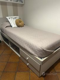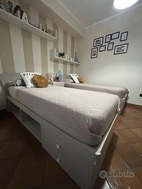 I letti si vendono a coppia, sono già dotati di rete ed eventuale possibilità di aggiungere il materasso. Sono in legno, color tortora e bianco. Hanno nella parte sottostante delle aperture/ librerie. Un letto ha anche 4 cassetti mentre l’altro ne possiede 2 .