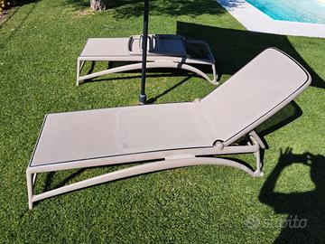 Vendo coppia di lettini in polipropilene in finitura opaca color tortora. Impilabili, schienale reclinabile in 4 posizioni, dotato di rotelline.