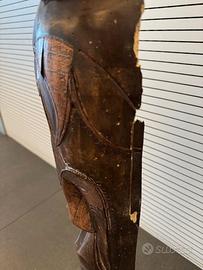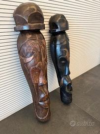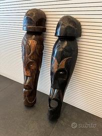 Vendo coppia di maschere africane in legno da appendere a parete, realizzate, dipinte e intagliate a mano. Ottimi oggetti d'arredamento donando un delizioso tocco etnico. Dimensioni: Altezza della grande: 660 mm, altezza della piccola: 625 mm. Vendo la coppia e non singolarmente. Una delle maschere presenta una scheggiatura sul fianco dovuto ad un piccolo urto subito durante i vari traslochi.