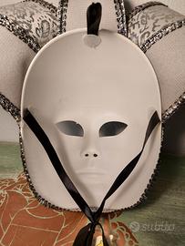 Maschera bianca/argento: rifiniture raffinate, copricapo in tessuto con dettagli decorativi. Completa di cartellino di certificazione e marchio “Oro Veneziano”, come visibile in foto.