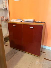 Vendo set di mobili coordinati in finitura rosso lucido e legno, perfetti per ufficio, studio professionale o zona living.