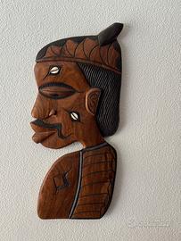 Vendo bellissima coppia di pannelli decorativi in legno intagliato a mano, raffiguranti volto maschile e femminile in stile arte africana.