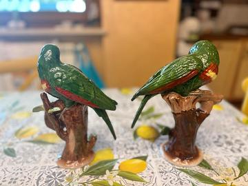 Splendida coppia di pappagalli realizzati in gesso e rifiniti con smaltatura policroma. Ogni esemplare, alto circa 25 cm, è caratterizzato da una vivace combinazione cromatica: predominanza di verde e marrone, con dettagli in rosso, blu e giallo che esaltano le piume e i tratti ornamentali. Le superfici smaltate donano luminosità e profondità ai colori, mettendo in risalto il pregio decorativo. Ideali come elementi d’arredo o da collezione, uniscono eleganza e vivacità, portando un tocco esotico e raffinato all’ambiente.