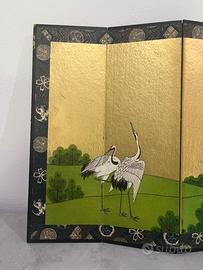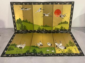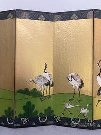 Coppia di Paraventi da Tavolo Giapponesi – Periodo Shōwa (1926–1989) Raffinata coppia di paraventi da tavolo (byōbu) giapponesi a sei pannelli, realizzati e dipinti a mano durante il periodo Shōwa. Le superfici, impreziosite da un luminoso fondo in foglia d’oro, raffigurano eleganti gru (tsuru) immerse in un paesaggio armonioso di pini (matsu) e dolci colline verdi. Nella tradizione giapponese, questi elementi sono simboli di longevità, prosperità e buon auspicio, rendendo l’opera non solo decorativa ma anche ricca di significato. La struttura è realizzata in legno leggero, rivestita in carta washi (o seta) e rifinita con materiali tradizionali. Ogni pannello è unito secondo la tecnica classica che consente una piegatura fluida e naturale. Firmati 峰雲画 (Hōun ga) con sigillo rosso, a garanzia dell’autenticità artistica. 📏 Dimensioni: 57,5 × 28,5 cm (ciascuno) 📍 Origine: Giappone 🕰 Periodo: Shōwa (1926–1989) Oggetti di grande eleganza e collezionabilità, ideali per arricchire ambienti sofisticati, studi professionali o spazi dal gusto ricercato, portando un autentico tocco di estetica giapponese.
