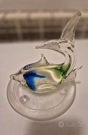 Coppia di pesci arredo, uno in terracotta dipinto, l'altro in vetro colorato con base a corredo