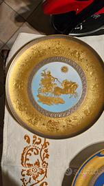 coppia di piatti Finzi, 1950 ca., diametro 34 cm., in porcellana decorati con segni zodiacali in oro a terzo fuoco e inciso.