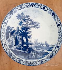 Coppia di grandi piatti in ceramica stile Delft da appendere. Diametro 39. Nuovi.(conservati, avevano ancora il prezzo in lire, che ho staccato ora)
