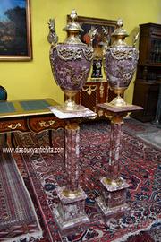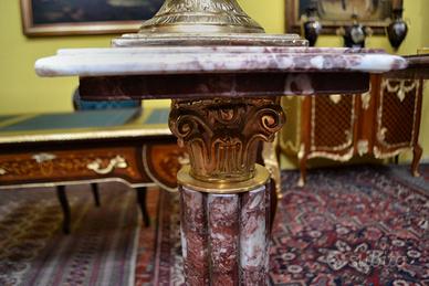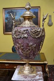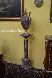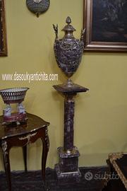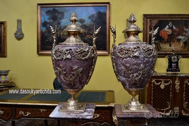 Imponente coppia di colonne-piedistalli con vasi decorativi chiamati cassolette in marmo rosso . Un insieme di grande impatto visivo, perfetto per arredare ingressi di rappresentanza o saloni classici. I vasi , presentano ricche applicazioni in bronzo cesellato e dorato con motivi a ghirlanda, festoni e foglie d’acanto che sembrano abbracciare il vaso, creando un contrasto elegante con la lucentezza del bronzo e il marmo . La coppia di piedistalli presentano un fusto scanalato in marmo coordinato, che poggia su una solida base quadrata. Dimensioni : Altezza totale 170 cm. Vasi , larghezza e profondità 17 cm. Altezza 65 cm. Coppia di colonne , larghezza e profondità 28 cm. altezza 105 cm. Chi fosse interessato a una visita virtuale della nostra galleria può accedere ai motori di ricerca, inserendo il nominativo " Dasouky antichita' " Per informazioni contattateci ai seguenti numeri Cell. Cell. EURO 1.200,00 SPEDIZIONE GRATUITA IN TUTTA ITALIA CON CORRIERE ESPRESSO