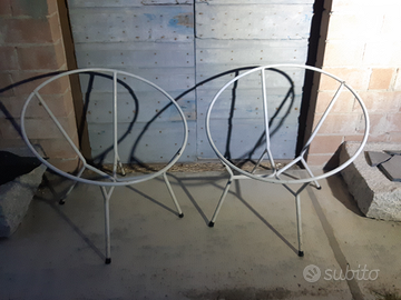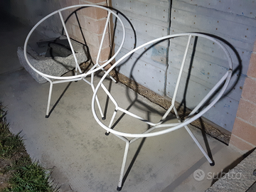 Telai in ferro di 2 poltroncine anni 70, mancanti del rivestimento in pvc colorato andato perduto ma facilmente ricollegabile anche da mano inesperta. I 2 telai bianchi sono ancora in ottimo stato e ben solidi.