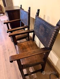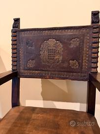Struttura in legno massello molto solida, con dettagli intagliati e schienale in cuoio lavorato con decorazioni centrali. Seduta in pelle in ottime condizioni. Poltrone eleganti e importanti, perfette per studio, salotto o ufficio di rappresentanza. Restaurate e pronte all’uso Nessun lavoro da fare Molto robuste Vendute in coppia Misure disponibili su richiesta. Solo ritiro a mano. Prezzo leggermente trattabile, no perditempo.