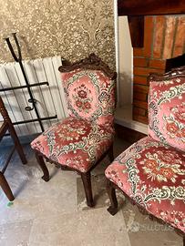 Vendesi coppia di eleganti poltroncine d'arredo, ideali per camera da letto, salotto o ingresso. Le sedute presentano una raffinata struttura in legno massello scuro, ricca di intagli artigianali sulla cimasa dello schienale e sulle gambe mosse "a cabriole".