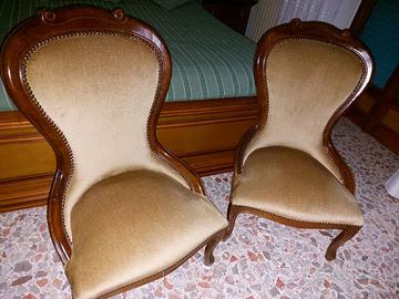 Coppia di poltrone da camera in stile classico vintage in legno e imbottite con tessuto di velluto color beige Rifinite e ben tenute.