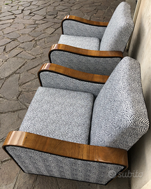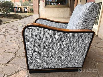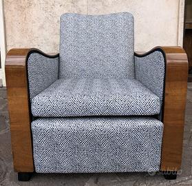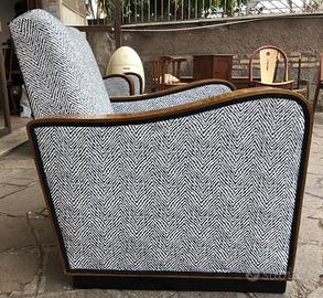 Coppia di poltrone in legno di noce bionda con piedi ebanizzati. Restauro conservativo della parte lignea con lucidatura a gommalacca, tecnica a tampone. Rifacimento tappezzeria con cinte e molle. Tessuto nuovo, perfetto stato. Art Deco. Produzione italiana, anni '40. Dimensioni poltrone, massimo ingombro: cm L 74 x P 80 x H 76 H seduta 41.