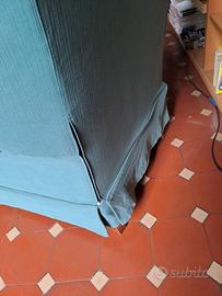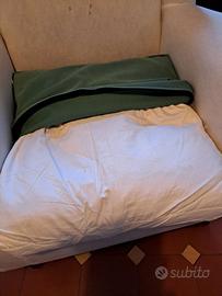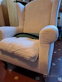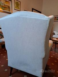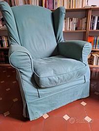 Coppia di comode poltrone rivestite di stoffa verde, piedi in legno, braccioli robusti e poggia testa. Prodotte nel 2010. Una delle due presenta un leggero danno sulla fodera dello schienale. Fodere estraibili e lavabili. Cuscino imbottito con vere piume d'oca. Misure: h. da terra a seduta cm.47, h. da terra a poggia testa cm.107, larg. inclusi i braccioli cm. 82.