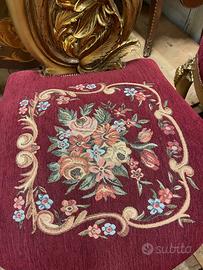 In legno e foglia d’oro, con decorazione floreale, impreziosita con schienale interamente decorato.