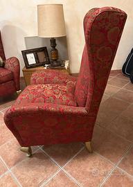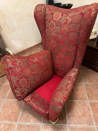 Due poltrone classiche di stile bergère, fatte artigianalmente, rivestite in tessuto damascato di colore rosso. Cuscini per seduta in piuma e sfoderabili. Vendesi anche singolarmente: Euro 250,00 ciascuna, Euro 450,00 la coppia