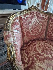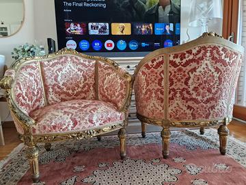 splendida coppia di poltrone in stile luigi xvi, legno massello finemente intagliato e dorato a foglia oro, rivestite in tessuto damascato in ottimo stato, con struttura solida e seduta comoda. Larghezza circa 83 cm, profondità circa 55. Pezzi di grande effetto ideali per un salotto classico, un ingresso elegante o come elementi di contrasto in un ambiente moderno. Vendo solo in coppia. Ritiro a carico dell’acquirente
