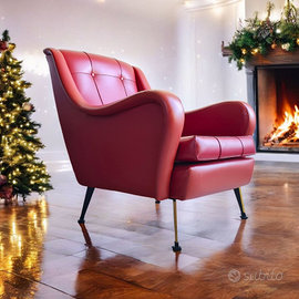 - Rivestita in similpelle rossa con impunture a griglia e bottoni tono su tono, una poltrona incarna l'eleganza del design italiano di metà secolo.