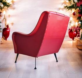 - Rivestita in similpelle rossa con impunture a griglia e bottoni tono su tono, una poltrona incarna l'eleganza e la leggerezza del design italiano di metà secolo.