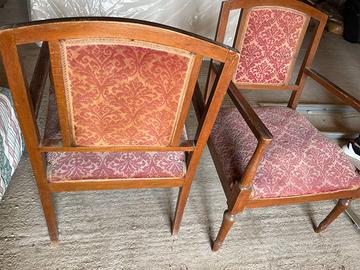 Vendo coppia di sedie con braccioli/poltroncine d'epoca. Struttura in legno con gambe anteriori tornite e rivestimento imbottito in tessuto rosso con motivo damascato su seduta e schienale.