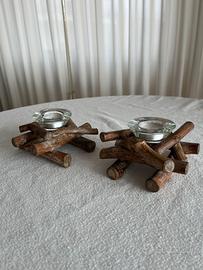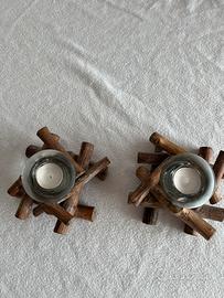Coppia di portacandere da tavolo, in legno intrecciato con contenitore in vetro.