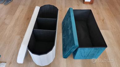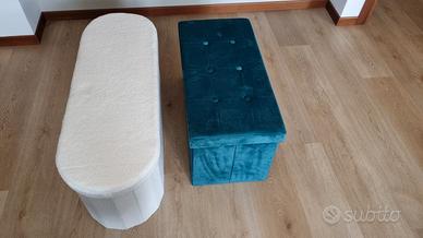 Vendo una coppia di pouf contenitori, uno bianco in tessuto 110x38x38cm e uno verde petrolio in velluto 82x40x40cm, condizioni ottime tutto a 60euro non trattabili più spese di spedizione.