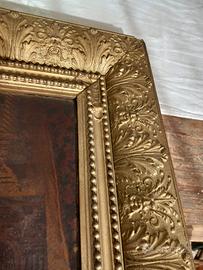 Quadro a stampa "uomo medioevale con ventaglio e spada" epoca incerta, dimensioni cm.66x45,5, intelaiato su grande cornice cm.86x66 in gesso dorato, + quadro simile "3 personaggi medioevali" stessa serie, dimensioni cm. 66x44, intelaiato su cornice cm. 85,2x64 (pur essendo della stessa serie le cornici differiscono di qualche cm).