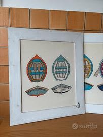 Coppia di quadri decorativi con tela ricamata all'uncinetto raffigurante barche colorate, montati su cornice in legno verniciato bianco. Lavorazione artigianale, ricamo ricco di dettagli e colori delicati che richiamano lo stile marinaro e l'atmosfera delle case al mare. Pertetti per arredare cucina, soggiorno, casa vacanze o per chi ama lo stile coastal, mediterraneo o handmade. Condizioni ottime, senza difetti, pronti da appendere. Venduti in coppia ma anche singolarmente, pezzi unici e difficili da trovare. (misure in cm in foto) #handmade #quadri #quadriartigianali #ricamoamano #arredamento #arredocasa #décoration #decorazionecasa #stilemarino #handmadeart #handmadeaccessories #fiberart #mediterraneanstyle