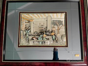 Elegante coppia di quadri di grandi dimensioni, ideali per arredamenti classici. Le opere presentano raffinati bassorilievi, lavorati con estrema cura nei dettagli. Primo quadro: due cavalli rampanti, simbolo di forza e dinamismo. Sencono quadro: scena conviviale, in una locanda d’epoca, con dettaglio policromi delicati. I bassorilievi sono incastonati su una base di vetro a specchio che dona profondità e luminosità all'ambiente. Le cornici sono imponenti, realizzate con finiture pregiate (effetto radica e mogano) e profili dorati. • Brand: Designer S.A.P. (firmati su placchetta metallica). • Stato di conservazione: Eccellente, pronti per essere appesi. PREZZO PER ENTRAMBI NON PERDITEMPO NO OFFERTE ASSURDE